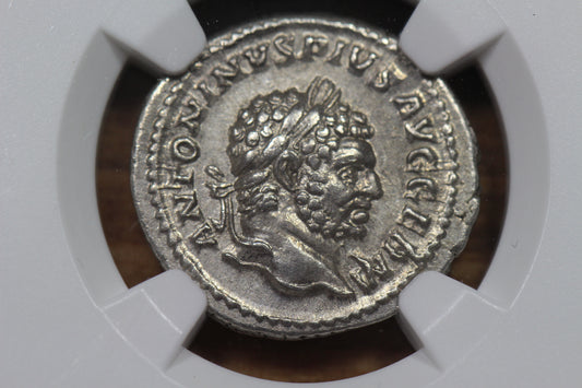 Emperor Caracalla Ancient Roman Silver Denarius Coin, 200 AD, NGC AU